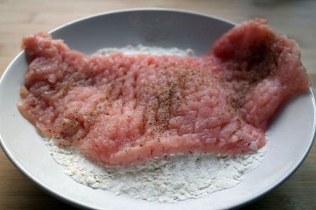 - Beat the pork chops well, salt and pepper. Then roll in flour on both sides.